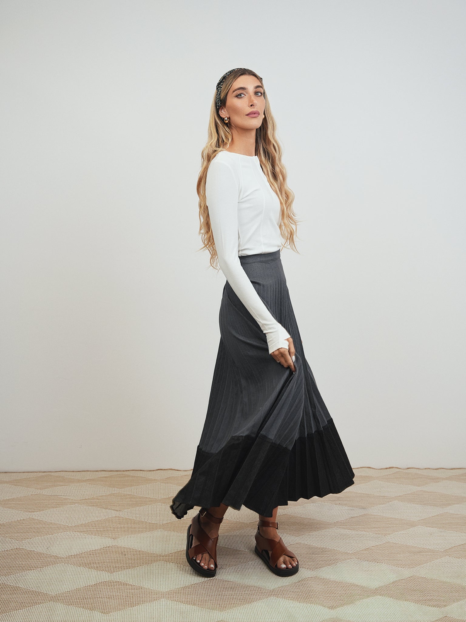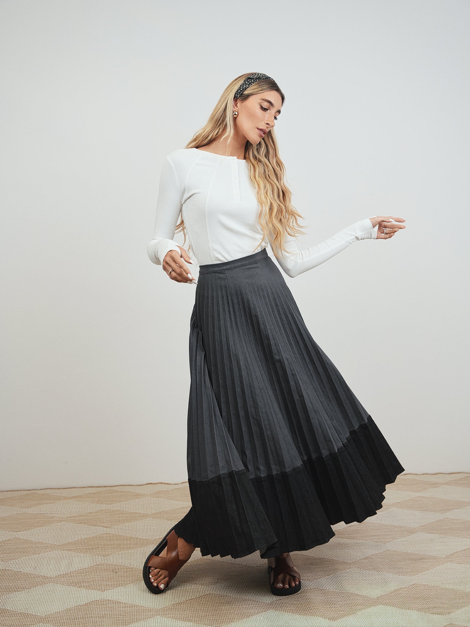 Colorblock Pleated Denim Skirt - Long