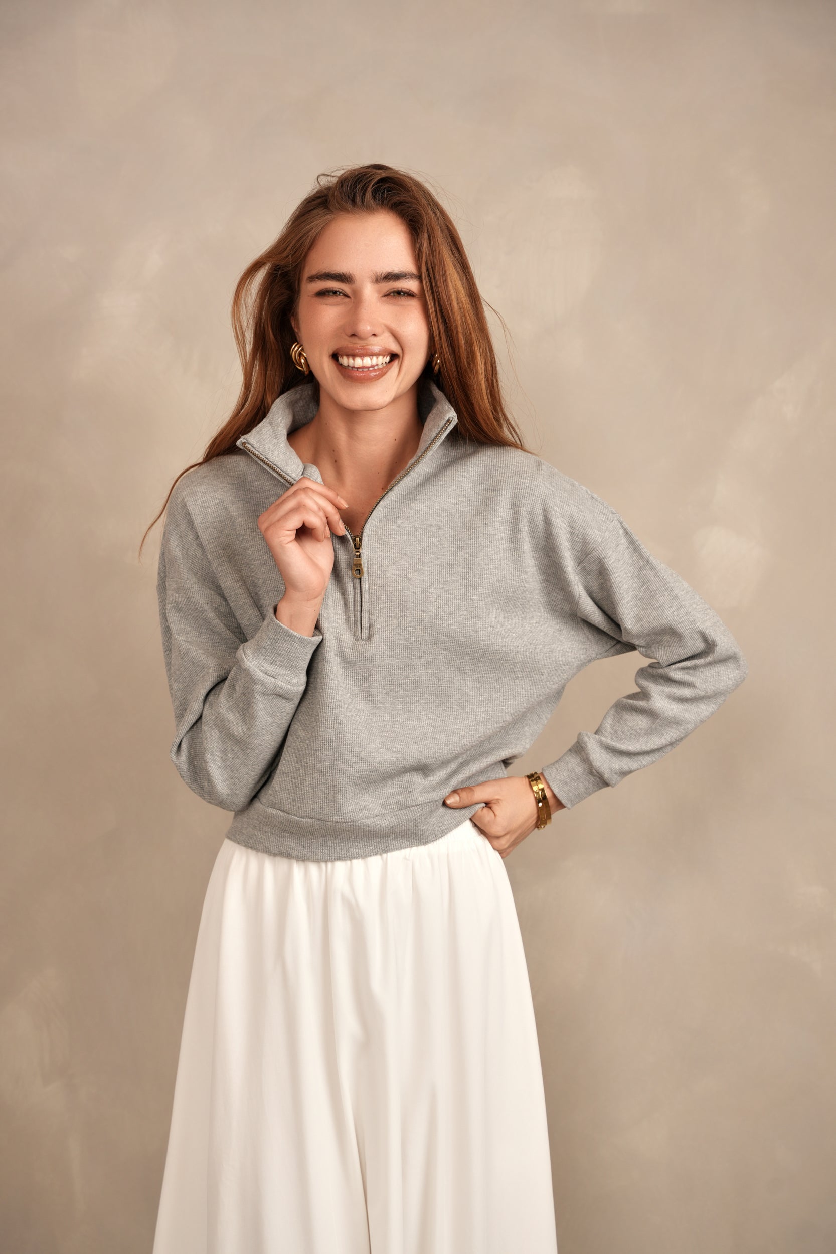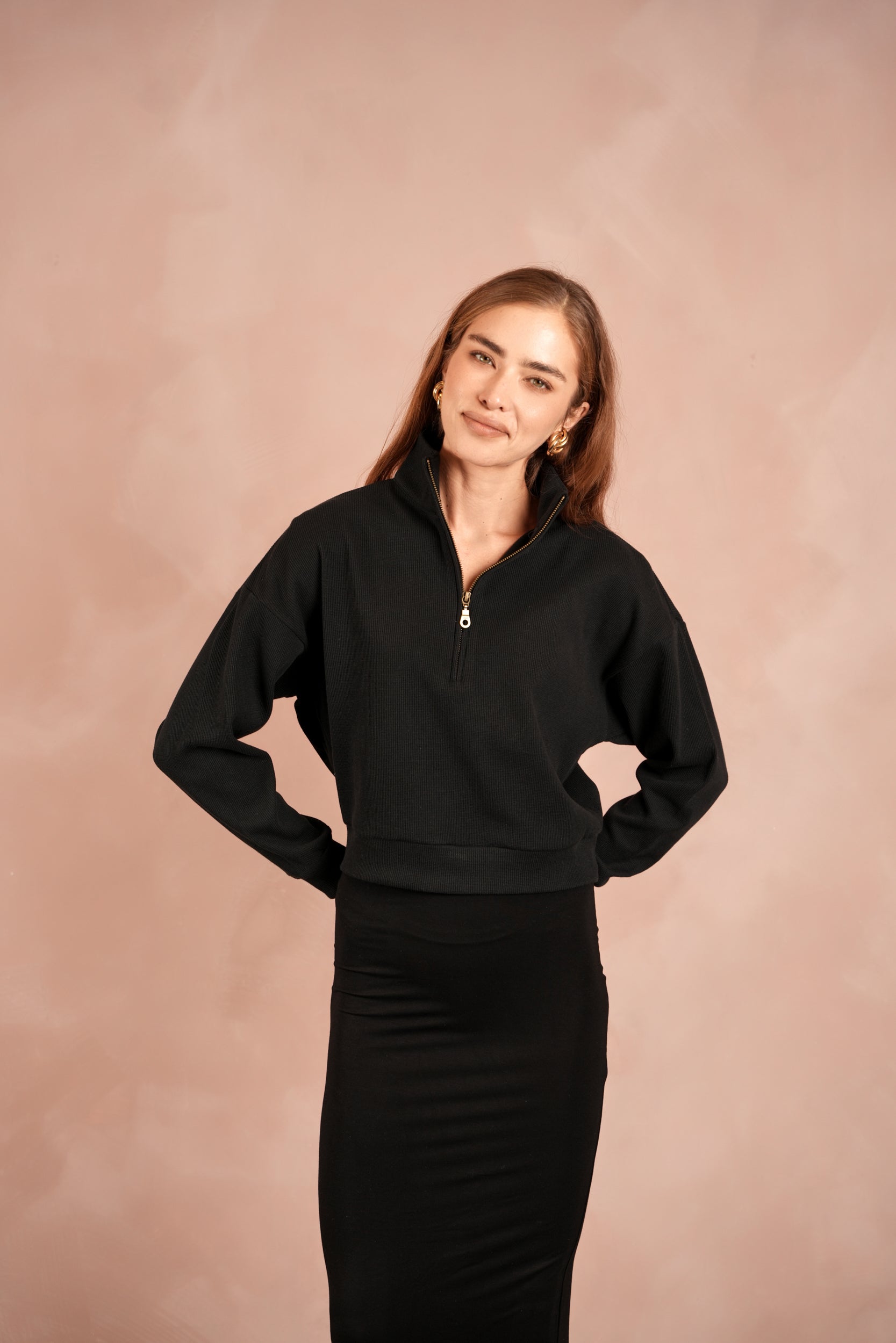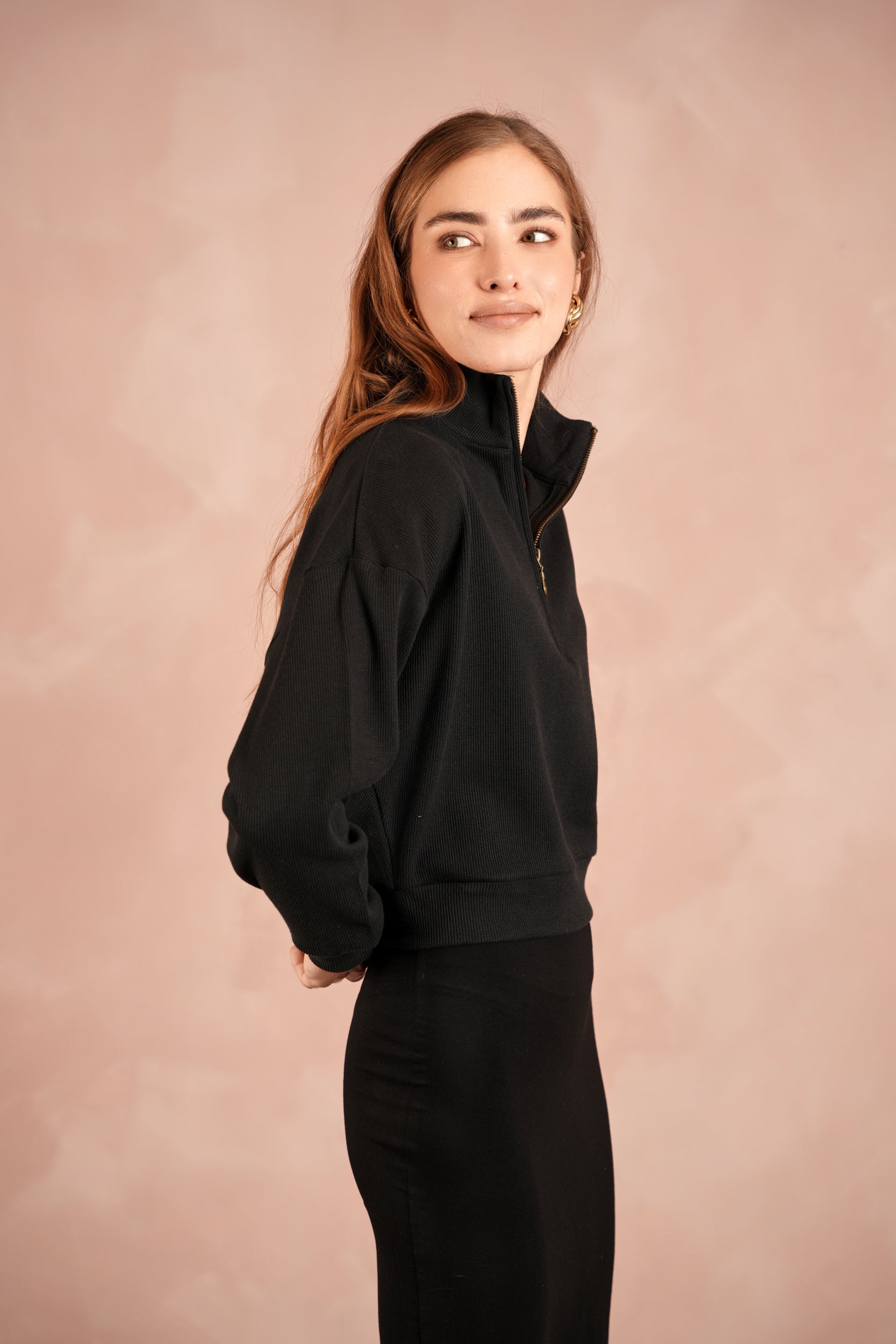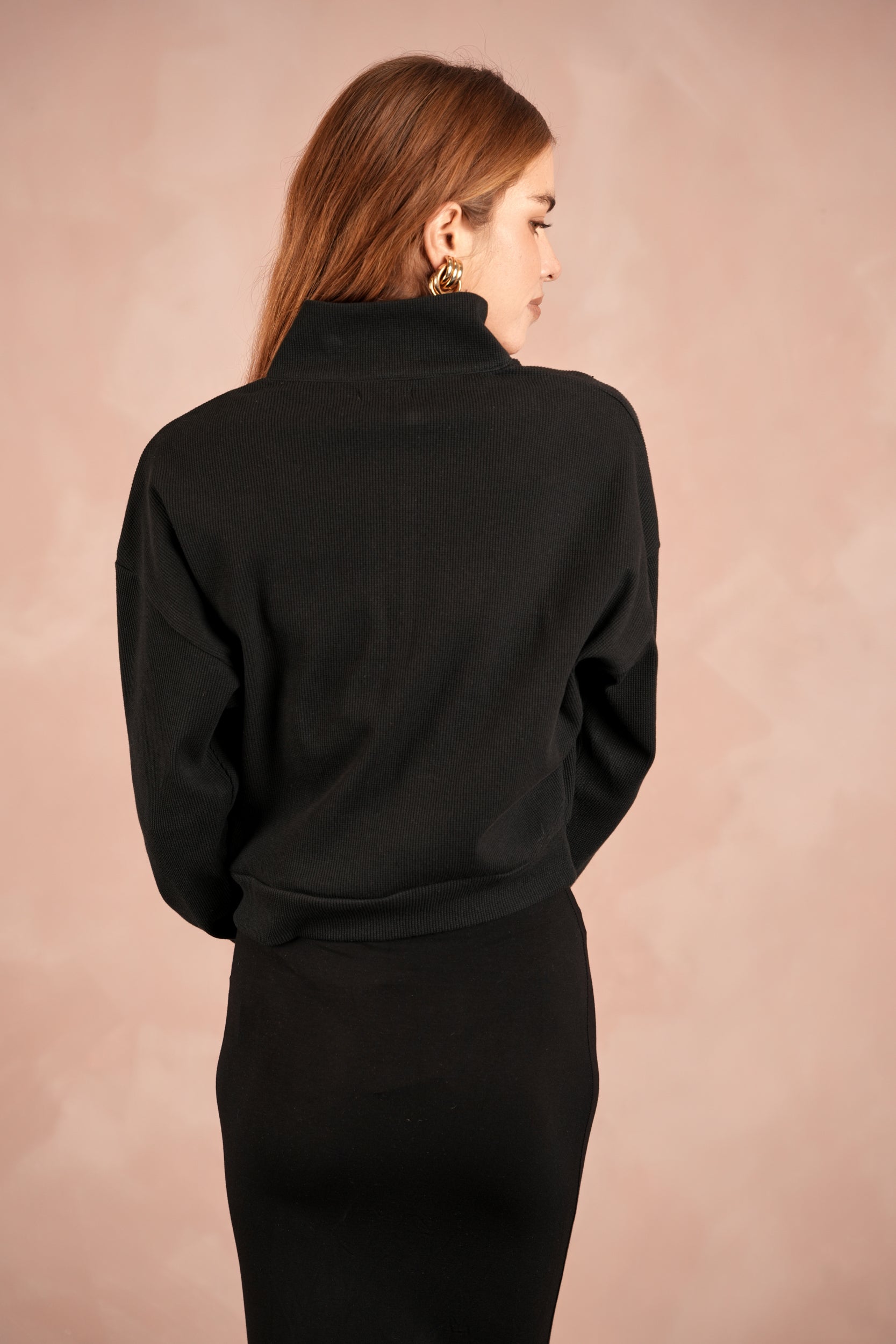 - Half-zip with high neck collar